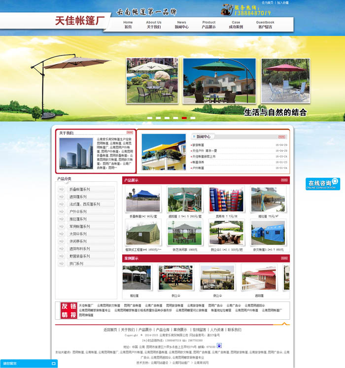 云南索樂商貿(mào)帳篷生產(chǎn)定做昆明帳篷,云南帳篷,云南昆明帳篷廠,云南昆明戶外帳篷,昆明戶外帳篷,云南昆明折疊帳篷,昆明折疊帳篷,云南昆明救災(zāi)帳篷,昆明救災(zāi)帳篷,昆明廣告帳篷,云南廣告帳篷,昆明旅游帳篷,云南旅游帳篷,昆明廣告?zhèn)悖颇蠌V告?zhèn)?,云南昆明遮陽傘等帳篷的專業(yè)生產(chǎn)廠家;云南索樂商貿(mào)有限公司旗下的天佳帳篷廠是一家集開發(fā)設(shè)計(jì)、生產(chǎn)、銷售戶外遮陽帳篷、活動(dòng)折疊篷、廣告帳篷、遮陽布料的專業(yè)生產(chǎn)廠家。 經(jīng)過多年的努力開拓、拼搏,本廠已擁有完備的生產(chǎn)設(shè)施和場地,有健全的組織機(jī)構(gòu)和雄厚的技術(shù)力量,有完善的生產(chǎn)管理和銷售服務(wù)系統(tǒng).產(chǎn)品銷售首先以云南為中心,逐步向全國輻射,良好的口碑使我們的帳篷很快就成為國內(nèi)外眾多知名品牌、企事業(yè)單位宣傳、促銷、廣告、慶典、休閑活動(dòng)必備器材的首選!廣泛應(yīng)用于展覽會、游樂園、別墅區(qū)、各類高檔賓館、餐廳、酒吧、咖啡廳、公寓,休閑度假旅游區(qū),休閑廣場,游泳池,海濱浴場,美食街,幼兒園,學(xué)校等戶外臨時(shí)活動(dòng)以及酒店、公寓樓的陽臺、露臺、陽光屋等休閑場所。