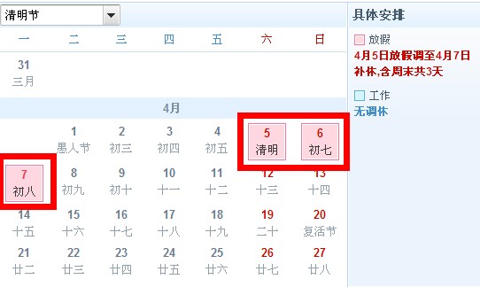 2014年4月5日至7日放假共3天。其中4月5日(星期六,農(nóng)歷清明當(dāng)日)為法定節(jié)假日,又剛好星期六公休,所能調(diào)到4月7日(星期一)補(bǔ)休。4月6日(星期日)公休。