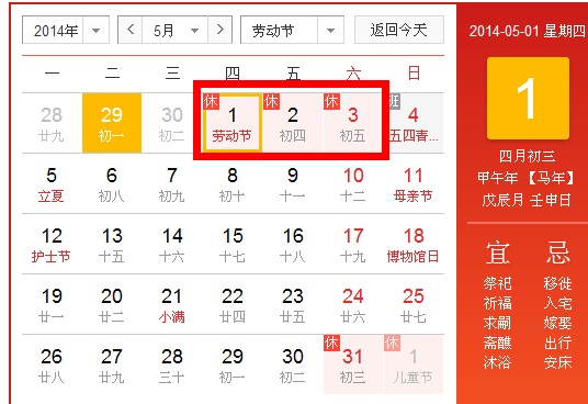 2014年5月1日至3日放假共3天。5月4日(星期日)上班。