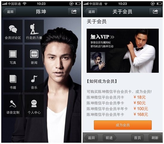 微信公眾賬號(hào)的新一輪玩法即將掀起。昨晚,娛樂(lè)明星陳坤的官方微信賬號(hào)吸引了眾人的注意。該賬號(hào)通過(guò)接入微信支付實(shí)現(xiàn)的會(huì)員功能,讓微信公眾平臺(tái)的增值服務(wù)價(jià)值被更多人所認(rèn)識(shí)。
